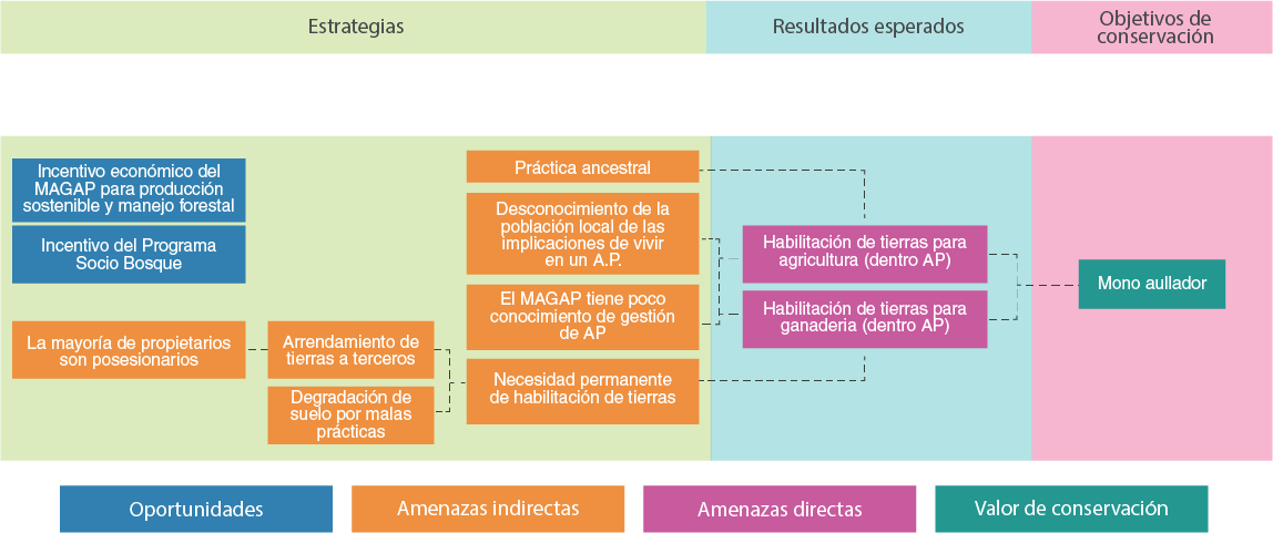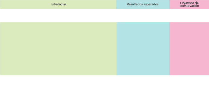 En síntesis los objetivos a largo plazo (10 años) se definen sobre los valores de conservación; los resultados a mediano plazo (3 a 5 años) se definen sobre las amenazas directas; y las estrategias apuntan a mitigar las amenazas indirectas. Miremos un ejemplo de la implementación de estrategias.
