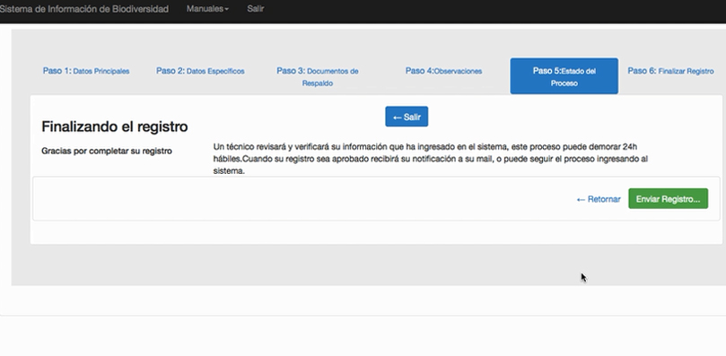 En el paso 5, Estado del Proceso, aparece un mensaje que indica que se está finalizando el registro, además, se informa que un técnico revisará y verificará la información que se ha ingresado en el sistema. Luego de este paso, cuando el registro sea aprobado, el usuario recibirá una notificación a través de su correo electrónico. Se hace clic en Enviar Registro.