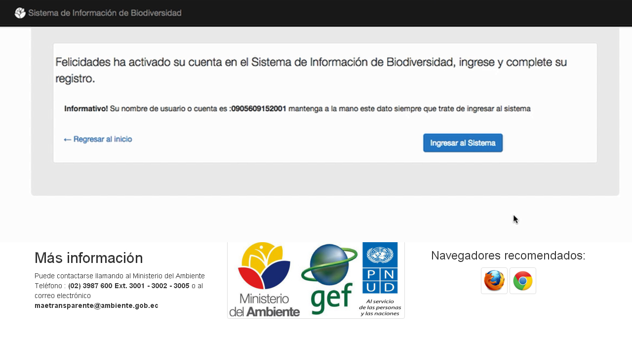 Aparece un mensaje que confirma que la cuenta se ha activado en el Sistema de Información de Biodiversidad. Se hace clic en Ingresar al sistema para completar el registro.