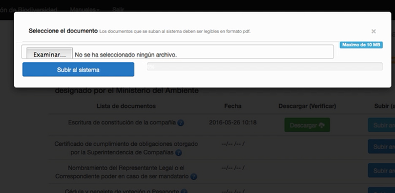 Para subir los documentos se hace clic en el botón de Subir archivo, se selecciona el archivo haciendo clic en Examinar y luego en Subir al sistema.